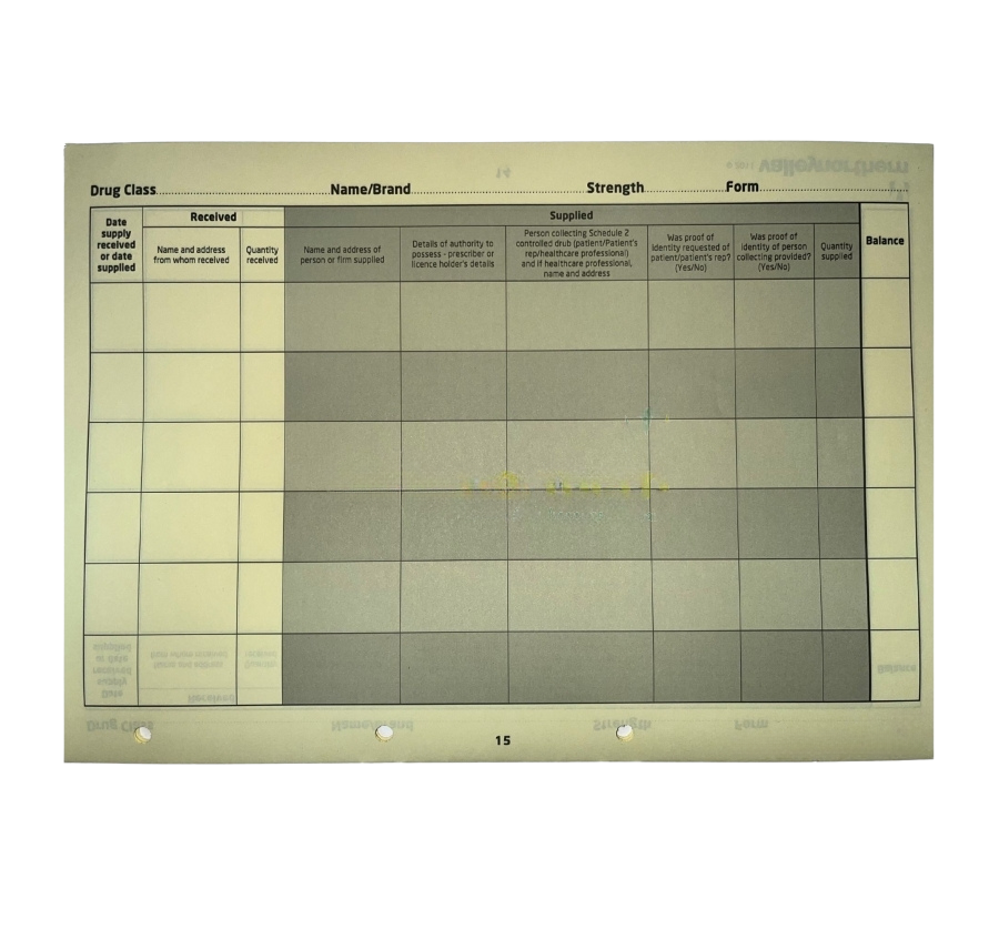 Each booklet comes with pre-punched holes, allowing easy insertion and removal from the binder. Inside, you'll find user-friendly, easy-to-complete tables that facilitate clear and accurate recordkeeping. With 14 pages per booklet, you have ample space to document crucial details, ensuring compliance with regulatory requirements and maintaining an orderly drug register.
